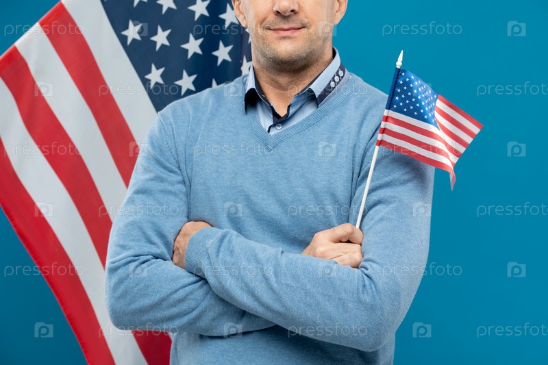 Современный адвокат или бизнесмен с небольшим флагом США, пересекающим руки на груди