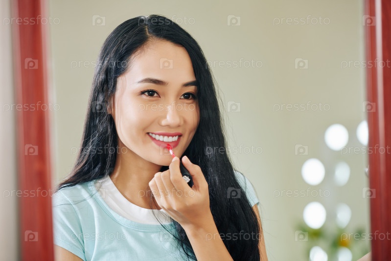 Женщина, наносящая красный губной глянц