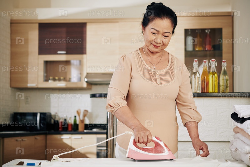 Старшая азиатская женщина гладит одежду