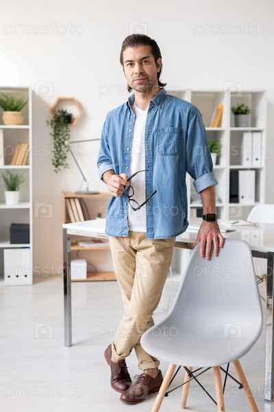 Современный молодой бизнесмен в повседневной одежде, стоящий на рабочем месте