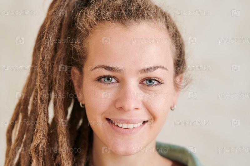 Портрет счастливой привлекательной голубоглазый студентки с дредольками, улыбающейся в камеру на сером фоне