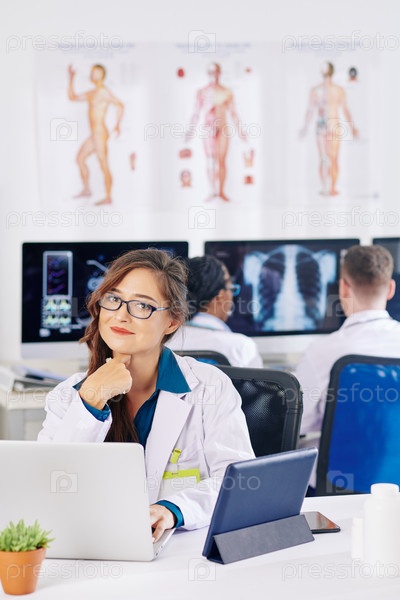 Красивый молодой доктор, работающий на ноутбуке