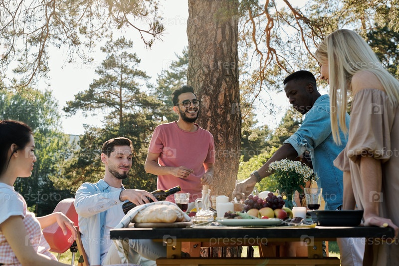 Молодой человек наливает красное вино в стакан, а другой пьет свежий виноград