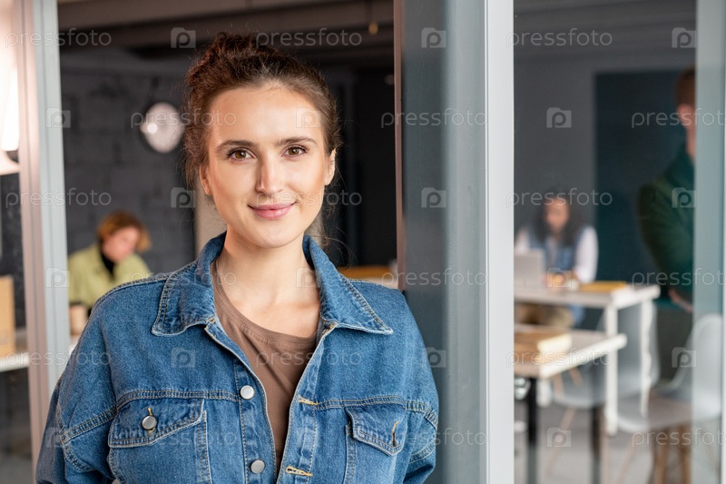 Молодая успешная женщина-менеджер офиса в джинсовой рубашке стоит у открытой двери