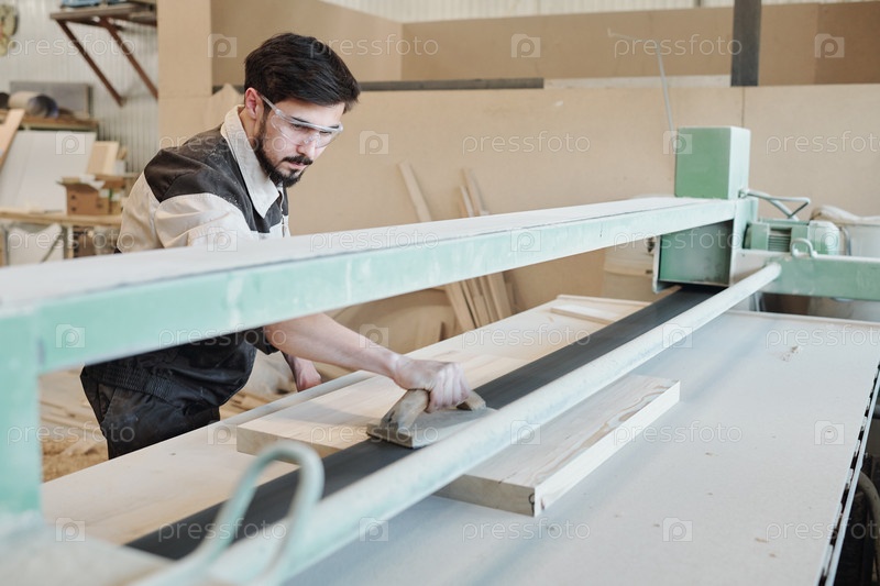 Молодой человек в рабочей одежде наклоняется над рабочим столом и сглаживает поверхность заготовки