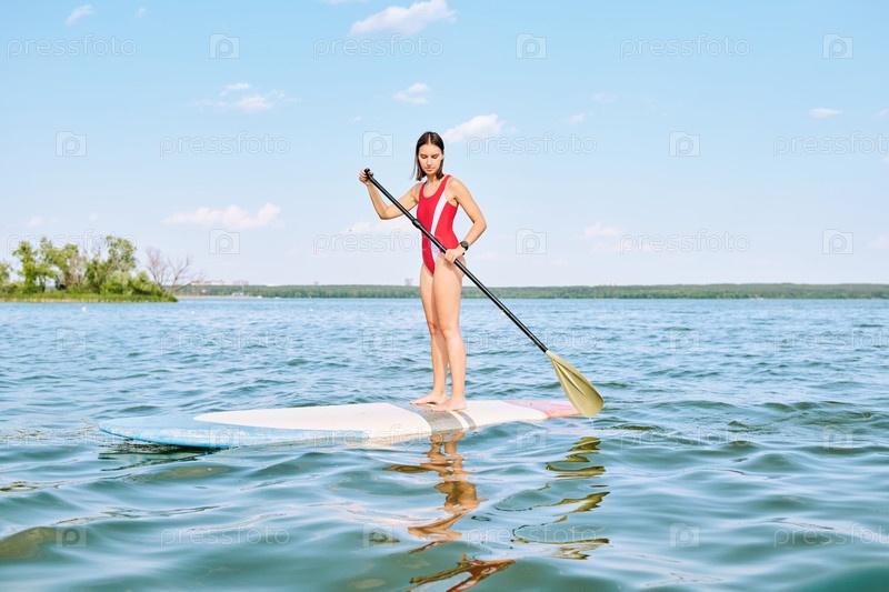 Молодая красивая брюнетка-спортсменка в красном купальном костюме плавает на доске для серфинга