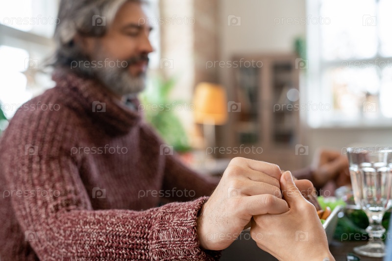 Руки зрелого бородатого мужчины с закрытыми глазами и его жена молятся перед ужином