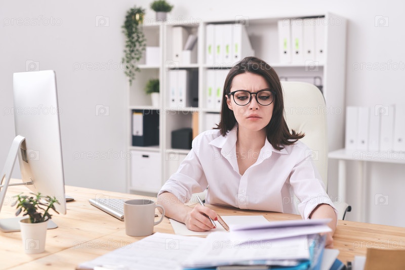 Молодая серьезная бизнес-леди смотрит на финансовую бумагу, делая заметки