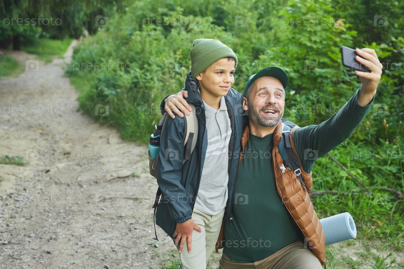 Отец и сын фотографируются во время похода