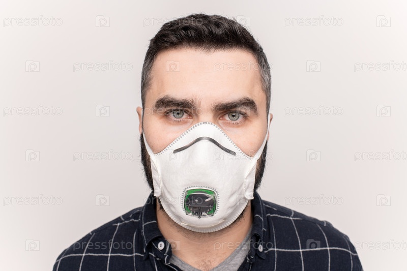 Молодой человек в респираторе и обычной квадратной рубашке стоит перед камерой