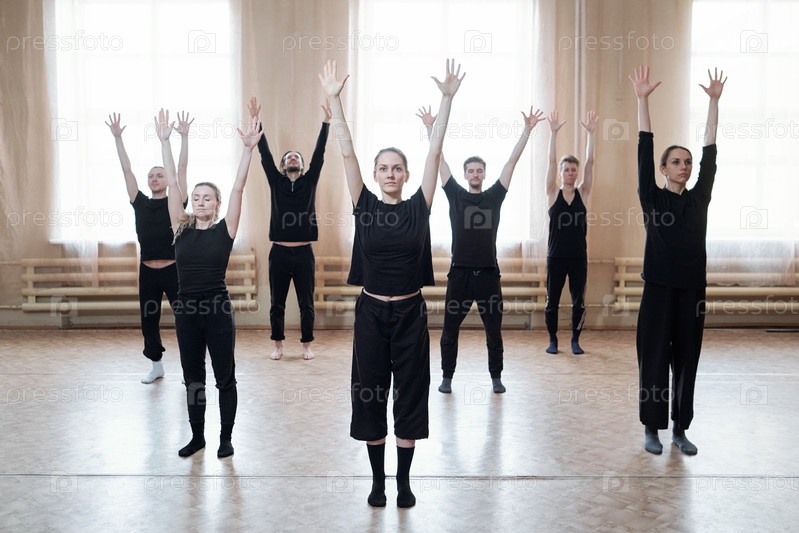 Группа молодых танцоров в черной активной одежде, поднимающих руки во время тренировок