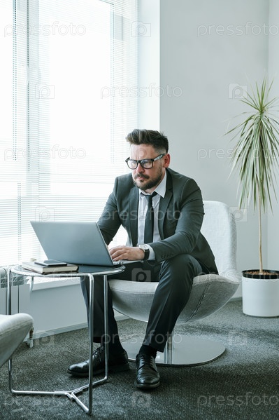 Молодой элегантный бизнесмен в формальной одежде использует ноутбук, сидя на кресле