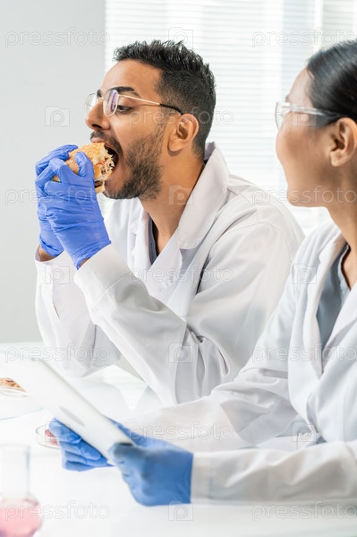 В перчатках молодой мужской работник управления пищевыми продуктами кусает гамбургер или чизбургер в лаборатории