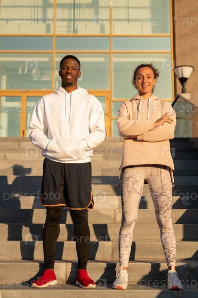 Счастливая молодая межкультурная спортивная пара в активной одежде, стоящая на лестнице