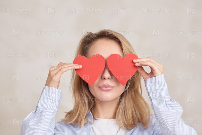 Красивая молодая женщина позирует перед камерой с двумя бумажными сердцами вместо глаз, копирование пространства