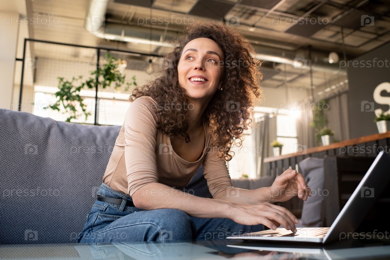 Молодая веселая женщина в бежевом пуловере и синих джинсах смотрит через окно