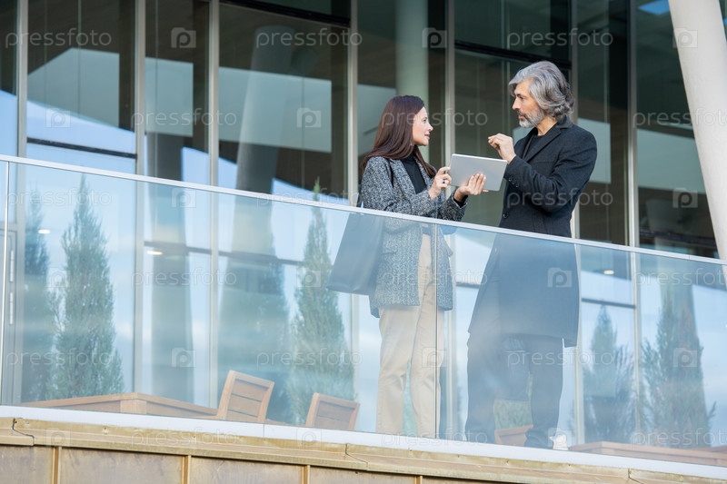 Молодая женщина с сенсорным панелем слушает зрелого элегантного бизнесмена в черном пальто