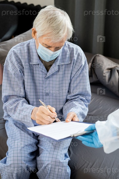 Больной старший пациент-мужчина в синей пижаме и медицинской маске подписывает документ