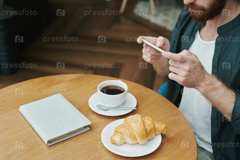 Молодой бородатый менеджер сидит за столом с чашечкой кофе и кроасаном и записывает голосовое сообщение для коллеги, используя смартфон в кафе