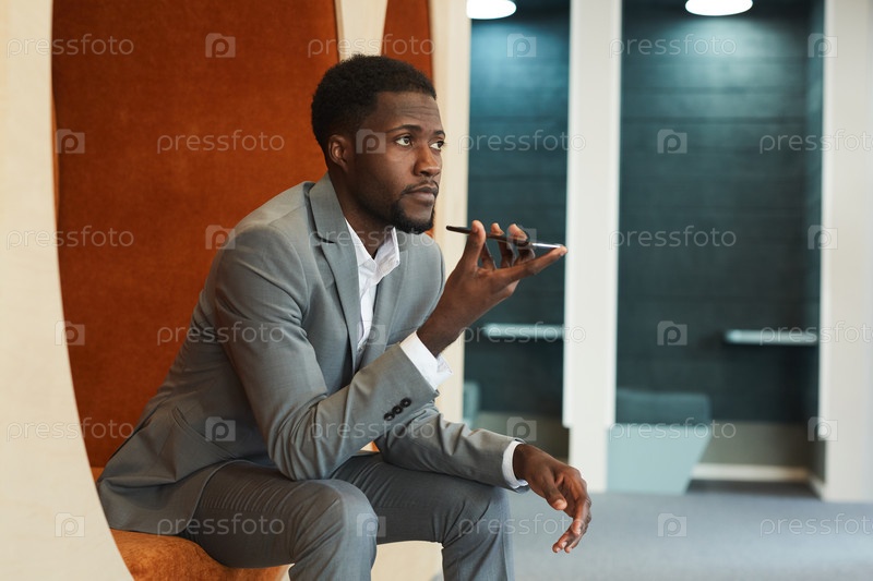Афроамериканский бизнесмен записывает голосовое сообщение через смартфон