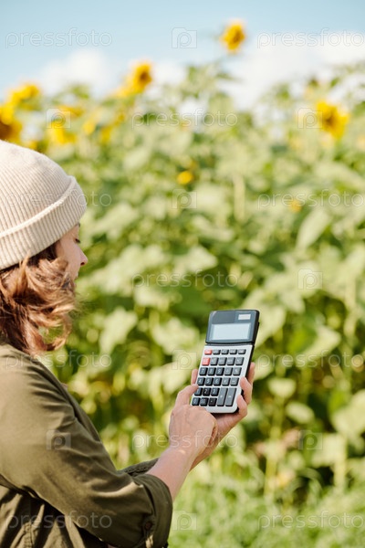 Зрелая фермерка в рабочей одежде держит калькулятор и нажимает его кнопки