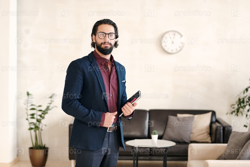Счастливый элегантный молодой бизнесмен с ноутбуком, стоящий перед камерой