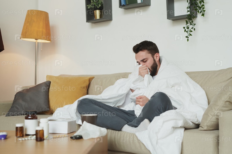 Больной мужчина с гриппом или коронавирусом сидит на диване в гостиной и кашляет