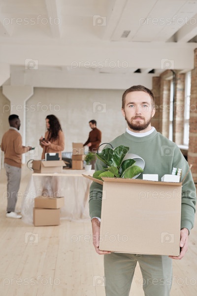 Портрет серьезного бородатого менеджера, держащего картонную коробку с личными вещами во время переезда в новый офис