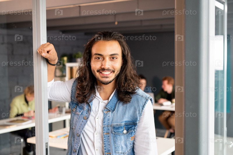 Счастливый молодой бизнесмен смешанной расы с зубчатой улыбкой стоит у открытых дверей