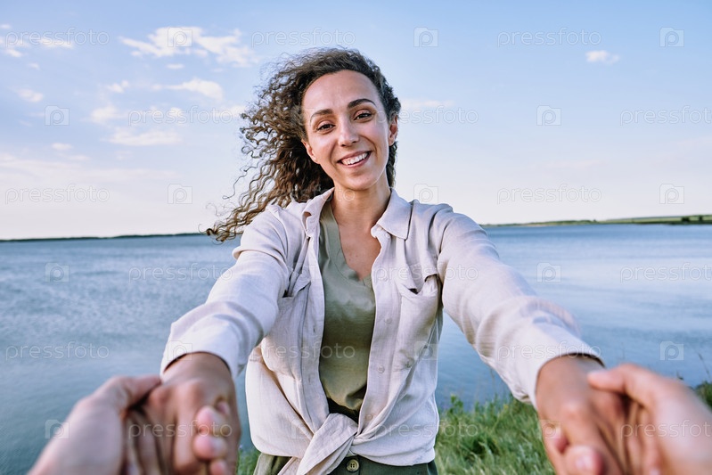 Счастливая молодая женщина смотрит на своего парня, держа его за руку
