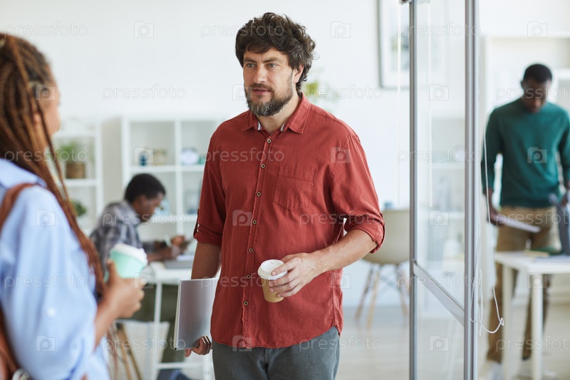 Бородатый менеджер разговаривает с коллегой в офисе