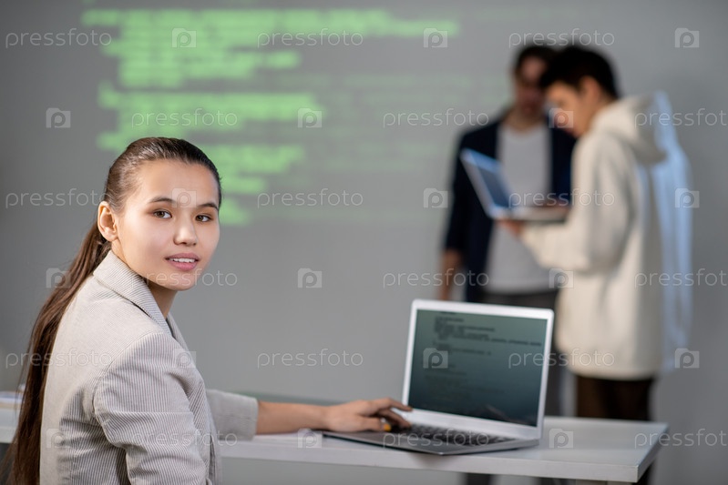 Умный молодой студент смотрит на тебя, сидя за столом перед ноутбуком