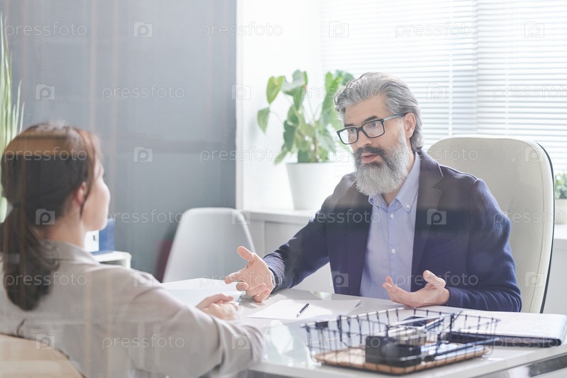Серьезный работодатель с седыми волосами и бородой сидит перед соискателем