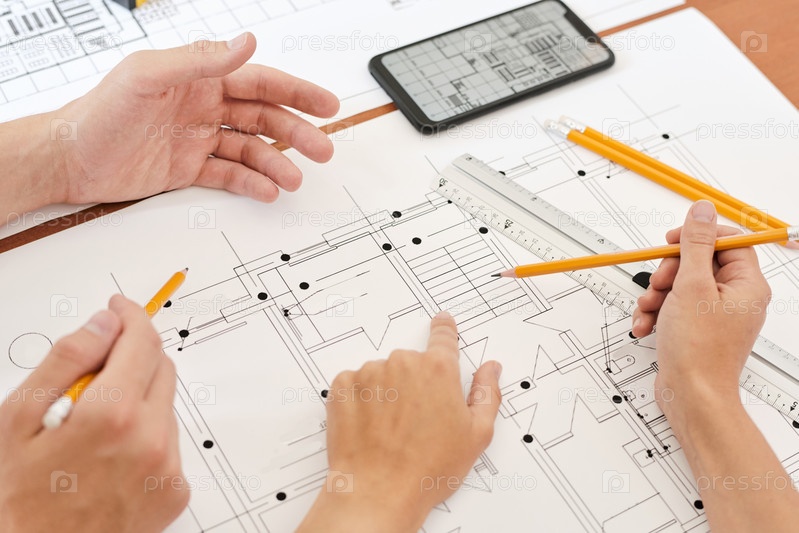 Рука молодого инженера с карандашом, указывающей на детали на эскизе нового здания