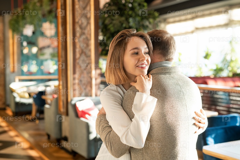 Счастливая юная улыбающаяся женщина обнимает своего ласкового парня