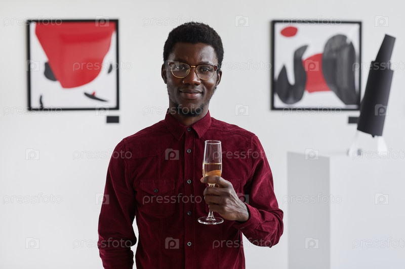 Африканский американец наслаждается шампанским на открытии художественной галереи
