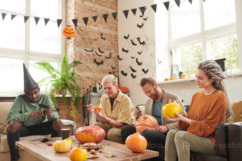 Группа любопытных молодых друзей, сидящих в комнате на чердаке и работающих над дизайном тыквы для Хэллоуина