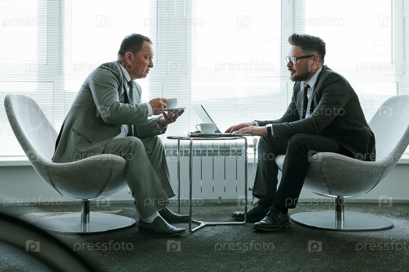 Два элегантных бизнесмена в костюмах, сидящих на креслах у окна офиса