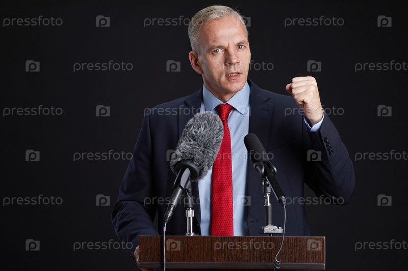 Страстный зрелый мужчина, выступающий с речью на подиуме