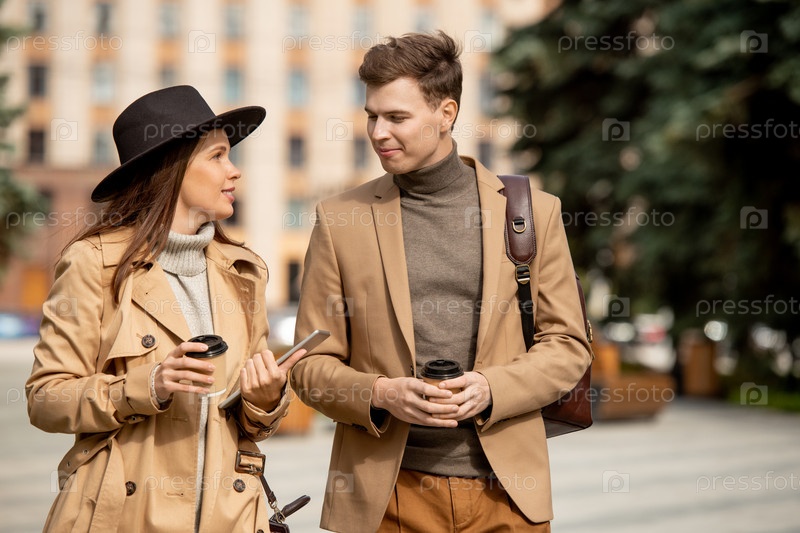 Счастливые свидания в бежевом casualwear разговаривать, выпивая кофе на ходу