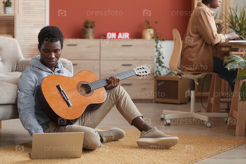 Молодой афроамериканец играет на гитаре, сидя на полу