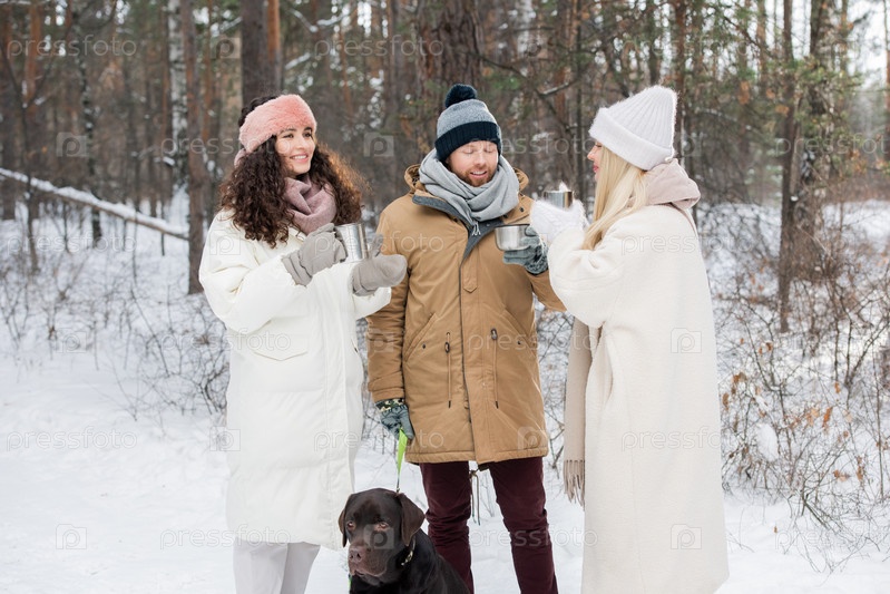 Счастливый молодой человек с черным ретривером и двумя девушками, которые пьют горячий чай и разговаривают