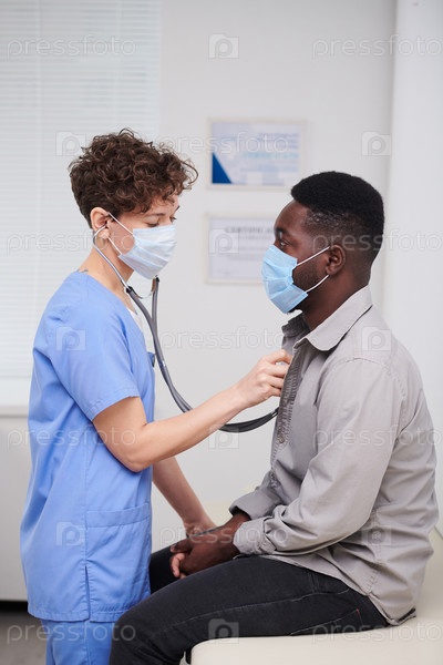 Вертикальный средний длинный боковой вид портретный снимок профессиональной женщины-врача в маске, осматривающей афроамериканского пациента с помощью стетоскопа