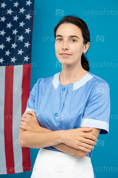 Молодая самоуверенная горничная в синей форме, скрестившая руки за грудь