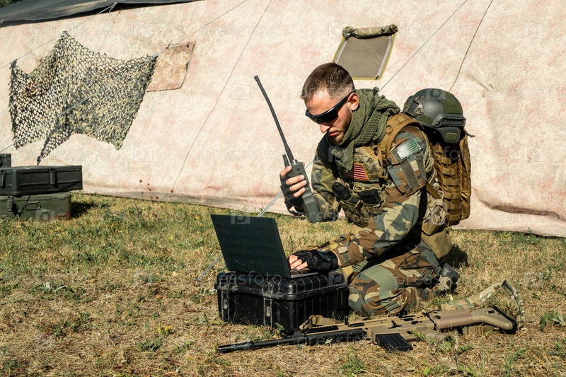 Солдат, работающий с ноутбуком