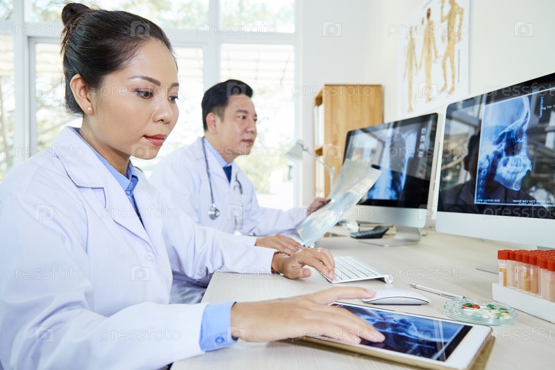 Два врача, работающих с рентгеновскими снимками за столом в офисе