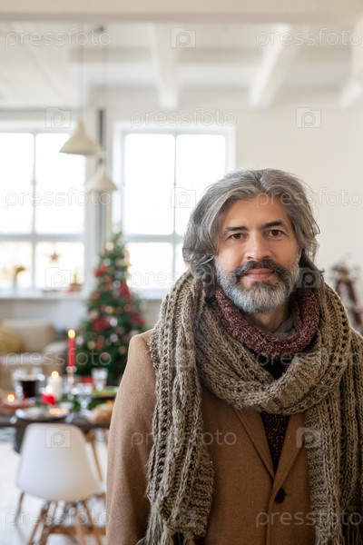 Зрелый седой мужчина в пальто и вязанном шарфе стоит перед камерой