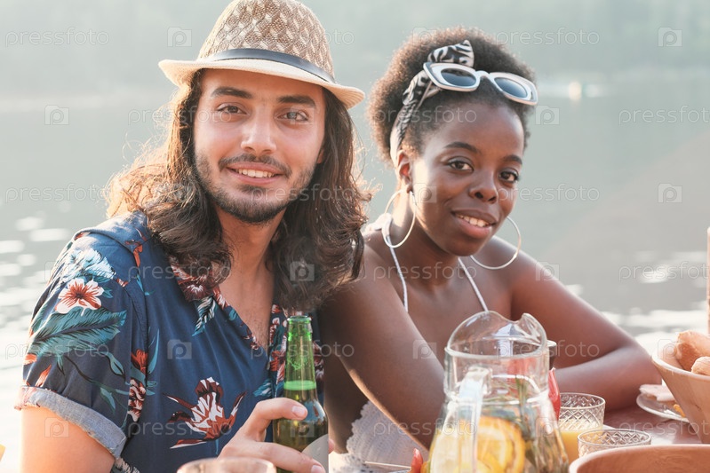 Мультиэтническая пара, сидящая на улице