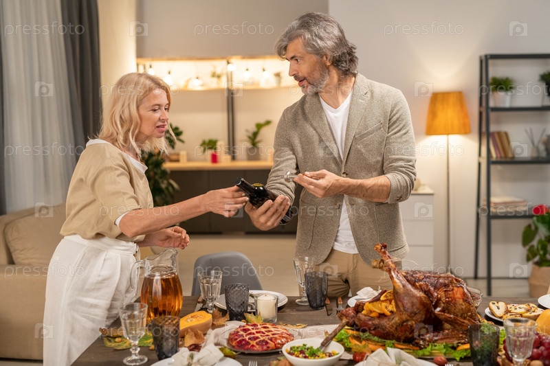 Зрелый мужчина в повседневной одежде показывает бутылку вина своей жене за подаваемым столом