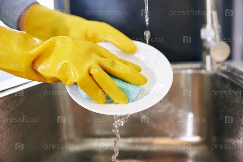 Домашняя хозяйка моет посуду